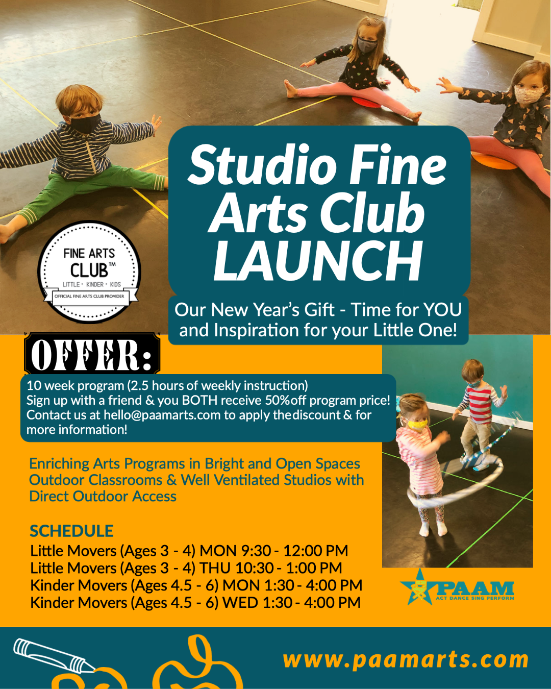 Indoor & outdoor classrooms with 15 hours of enriching programming & time for YOU, the parent!